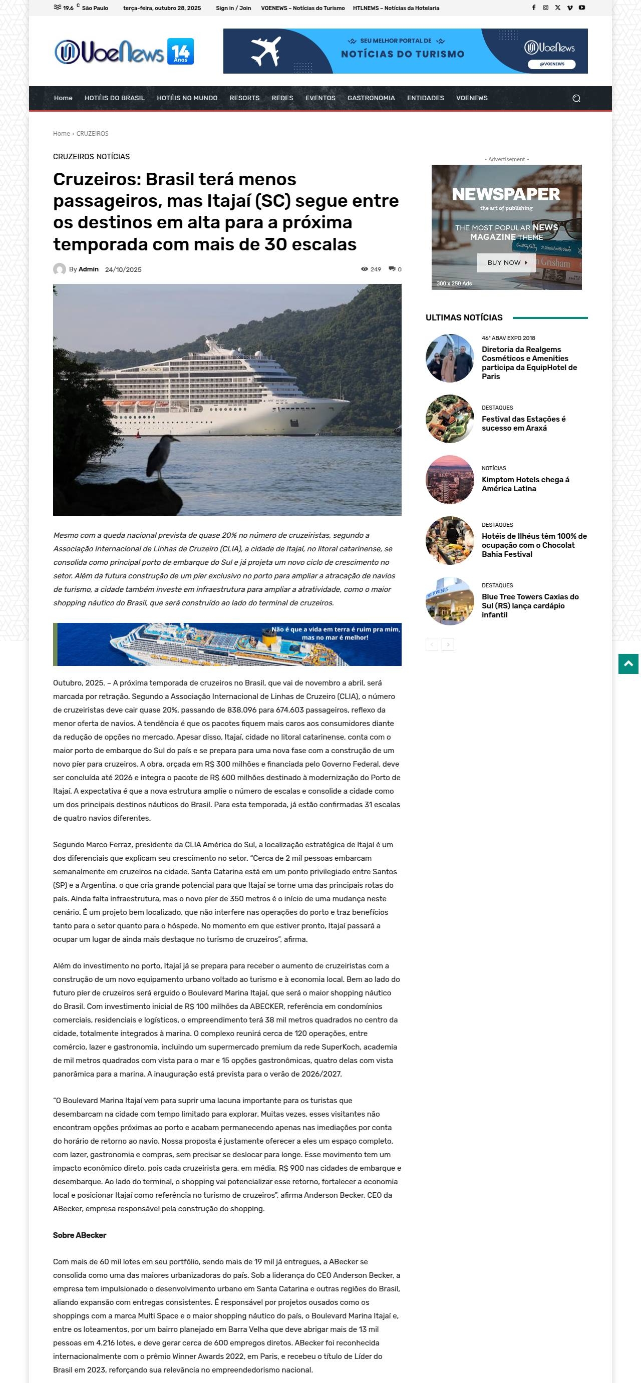 Cruzeiros: Brasil terá menos passageiros, mas Itajaí (SC) segue entre os destinos em alta para a próxima temporada com mais de 30 escalas VOENEWS - N